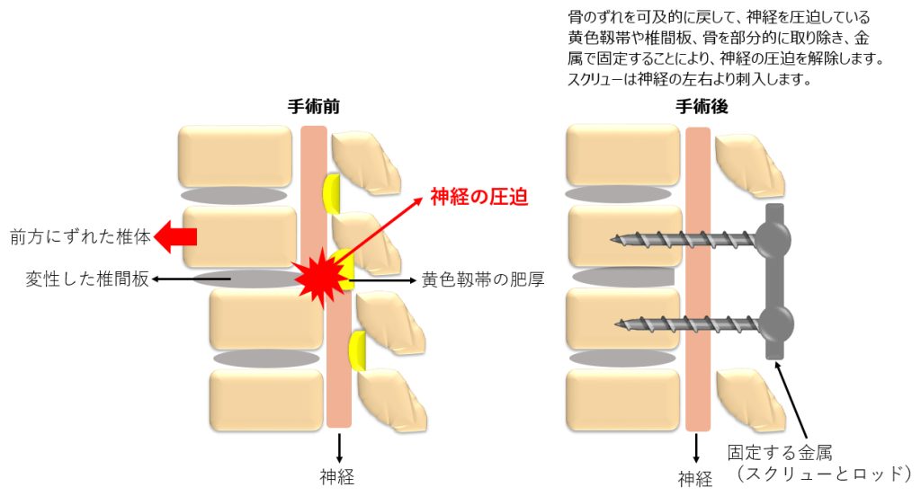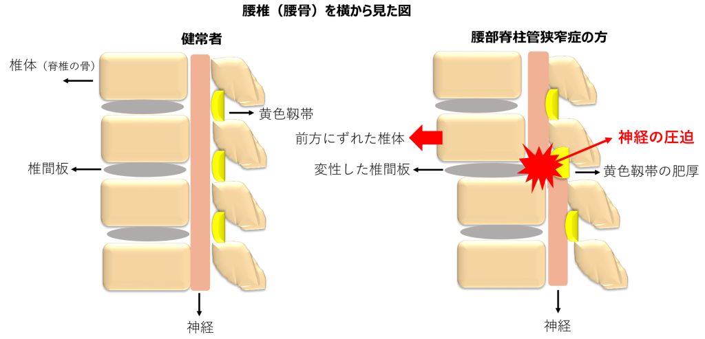腰部脊柱管狭窄症とは、腰椎が加齢に伴って変形し、腰椎の脊柱管(神経の通り道)の中を通る神経を圧迫することにより、足のしびれ・脱力・歩行障害(長い距離が歩けない)などの症状が出現します。