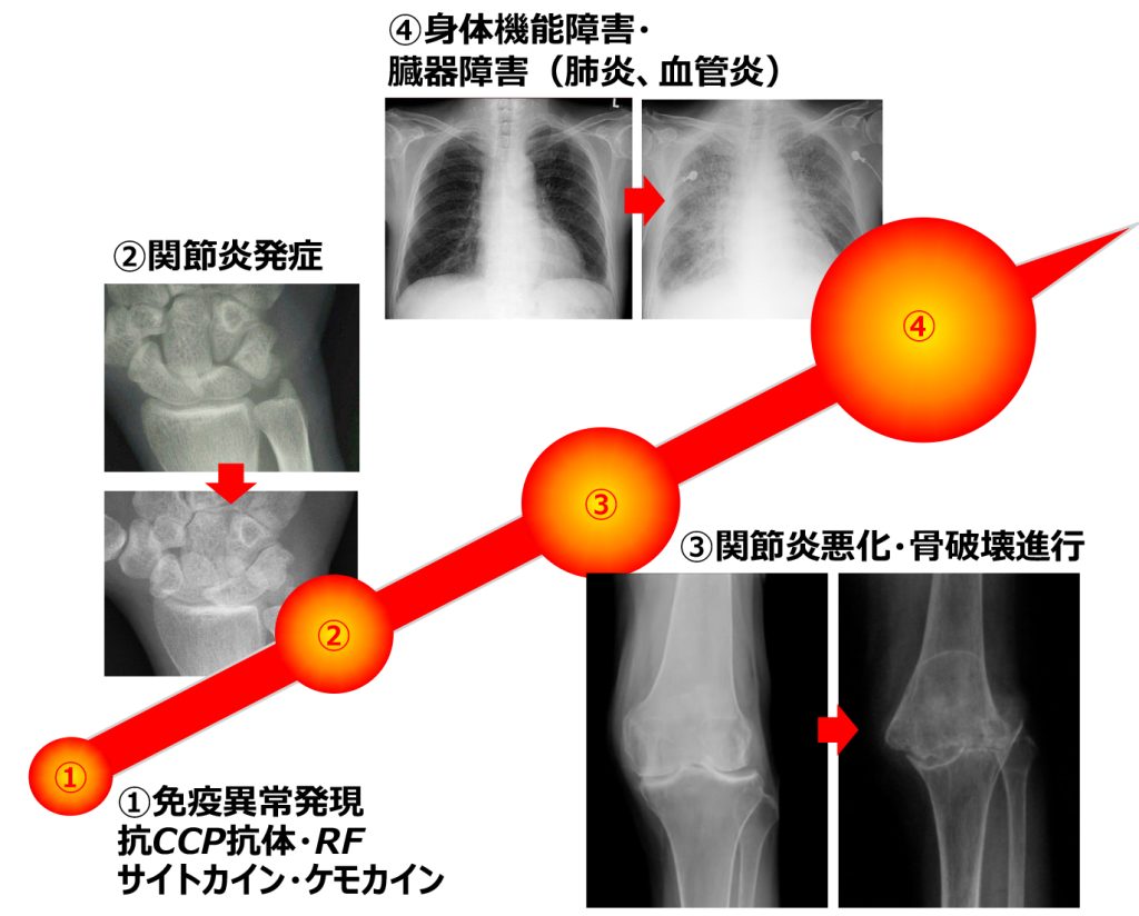 関節炎が継続、悪化しますと関節が破壊、変形します。さらには、関節で産生された炎症性を惹起する物質は血流にのって全身に運ばれ、肺炎などの臓器障害の原因となります。
