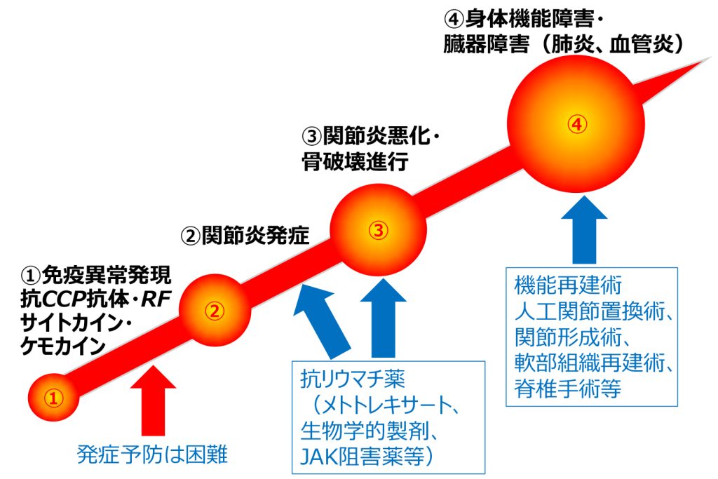 現在は抗リウマチ薬の進歩によって、寛解(かんかい)という、関節の痛みや炎症がない状態へとコントロールすることが可能になりました。また、関節破壊は発症2年以内に急速に進行することが分かり、早期診断・早期治療によって速やかに寛解へ導くことが重要と考えられています。また、何らかの理由で関節の機能障害が発生した場合には、機能再建術(手術)を行うことにより機能回復が期待されます。