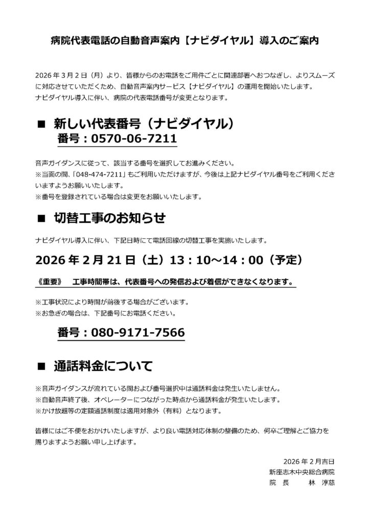 このたび当院では、ナビダイヤル(音声案内サービス)を導入することとなりましたので、ご案内致します。